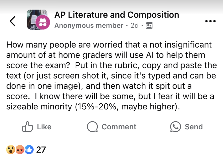 A question buzzing in educator forums, like a recent AP Facebook group discussion, asks: Could AP readers use ChatGPT for grading essays on the sly?